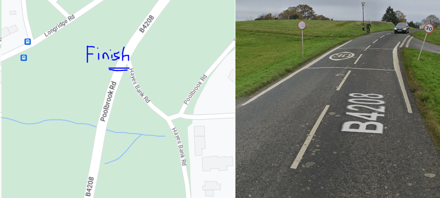 Where’s the end?! 30mph signs at the top of the little rise before the junction with Hayes Bank Road. Regroup at the bus stop after the Longridge Road/Churchdown Road crossroads.