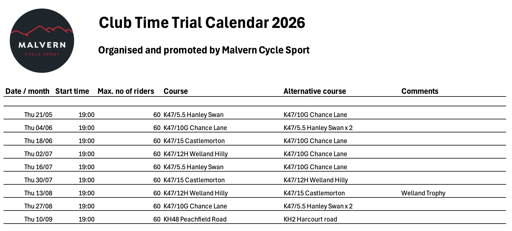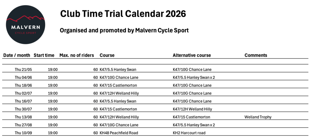 Malvern Cycle Sport run a calendar of club time trials each year, from May to September. Races take place on alternate Thursday evenings, with a 7pm start. In the event of bad weather, or issues such as roadworks on the courses, the course may be changed at short notice, or the event cancelled. For updates each week, please see our public Facebook page here: https://www.facebook.com/MalvernCycleSport